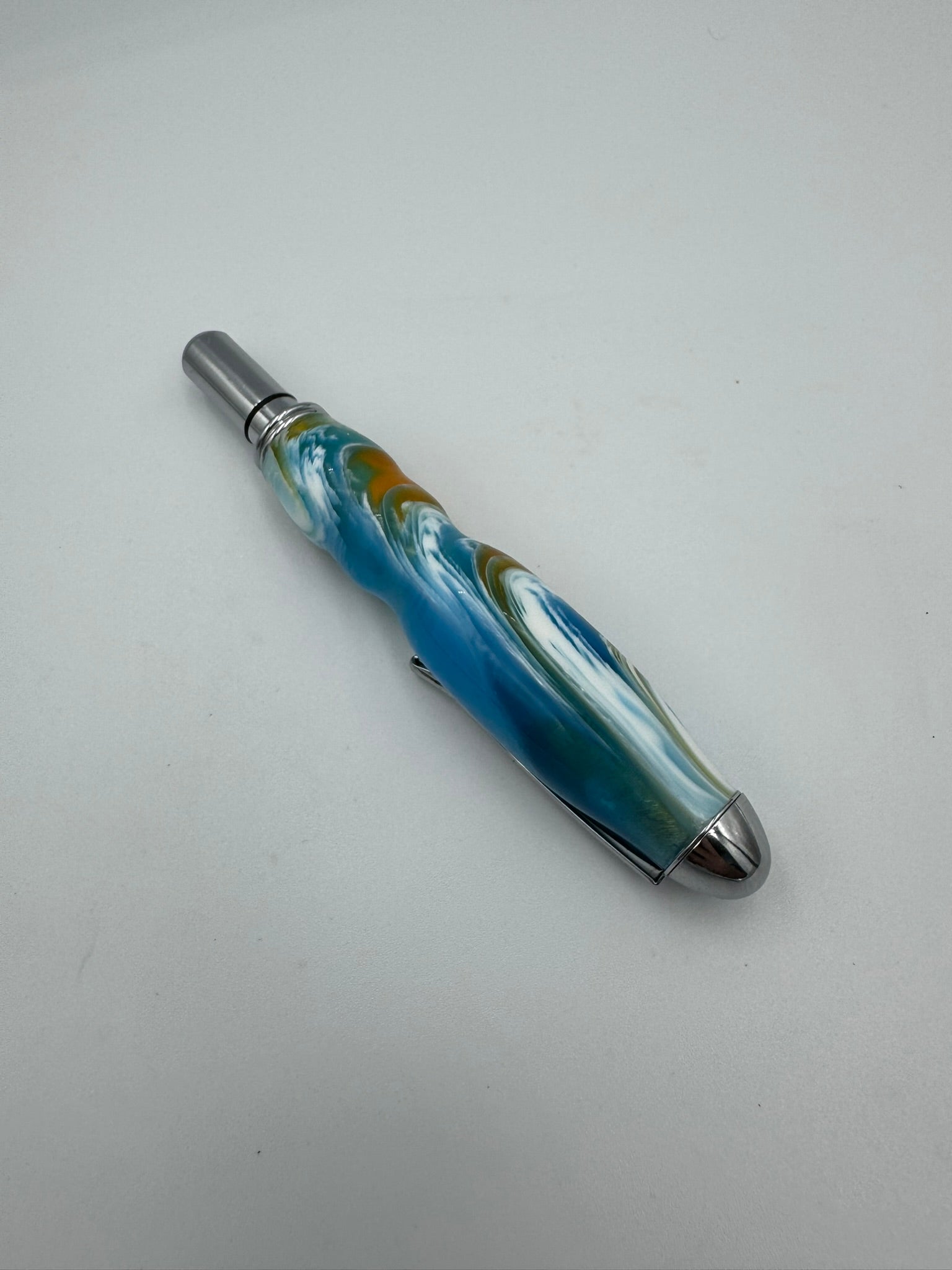 Hand-turned acrylic handle. Metal scissors.